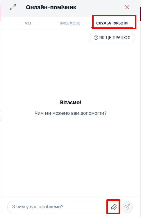 3. Якщо стикнетеся з технічною проблемою, зверніться до служби техпідтримки через розділ «Служба турботи». За потреби ви можете додати скриншот через іконку «скріпка».