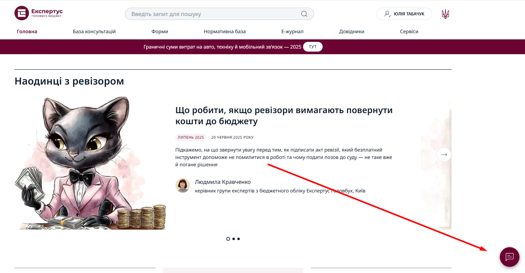 1. Якщо ви не знайдете в базі даних експертно-правової системи «Експертус Головбух Бюджет» опису робочої ситуації, аналогічної вашій, надішліть звернення до експерта за допомогою бордової кнопки «Онлайн-помічник». Вона розміщена в правому нижньому куті сторінки.