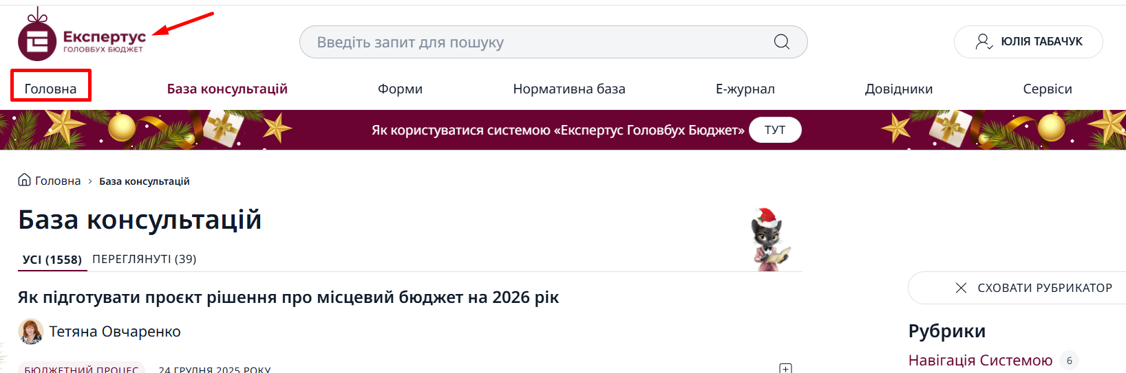 З головної сторінки можна перейти в будь-який розділ. Для того щоб повернутися назад — тисніть на розділ Головна або на логотип Експертус Головбух Бюджет: