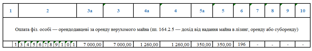 Відобразіть таку виплату з ознакою доходу «196» — лізинг, оренда або суборенда іншої нерухомості (наприклад, офісних, складських, торговельних приміщень, будівель тощо).