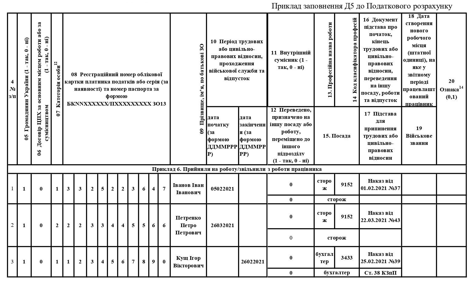 - Іванова Івана Івановича — на основне місце роботи на посаду сторожа (код КП 9152) з 5 лютого 2021 року, наказ від 01.02.2021 № 37;