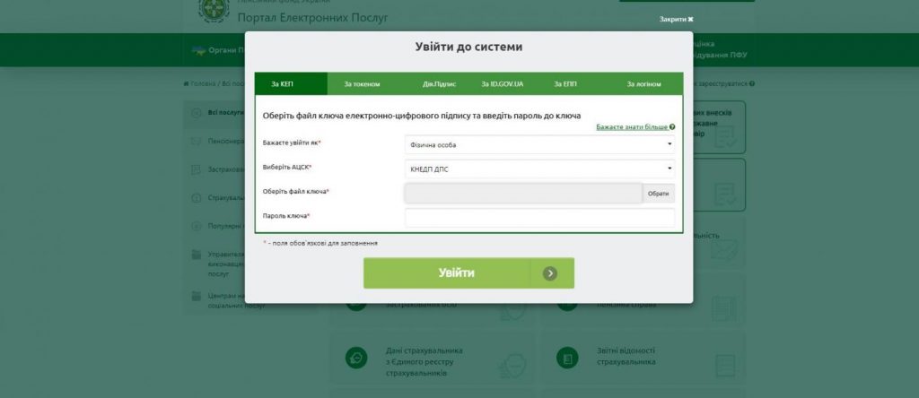 1. Зайдіть в особистий кабінет на вебпорталі е-послуг ПФУ з допомогою кваліфікованого електронного підпису (КЕП) (рис. 1).