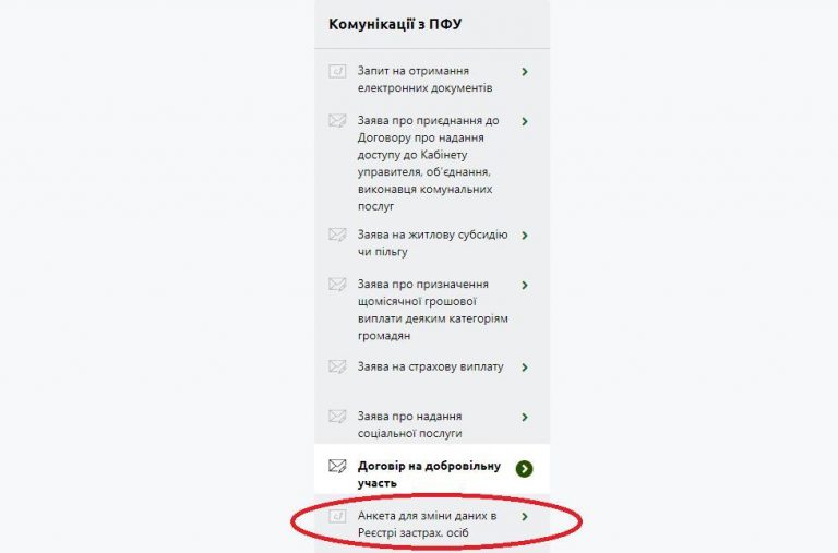 2. В лівому боковому меню розділу «Комунікації з ПФУ» (рис. 2) оберіть пункт «Анкета для зміни даних в Реєстрі застрахованих осіб» (далі — Анкета).