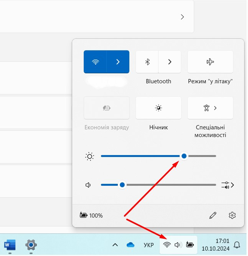 Клацніть на піктограму «Мережа» у правій частині панелі завдань. Перемістіть повзунок яскравості, щоб налаштувати її (рис. 1).