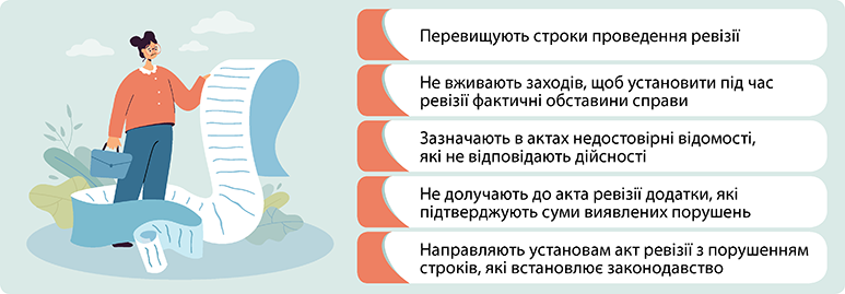 Для того щоб підтвердити власну компетентність та продемонструвати, що ревізію провели «продуктивно», кожен ревізор намагається запротоколювати якнайбільше порушень. Адже від результатів ревізії залежить розмір зарплати ревізора. Для того щоб досягти своєї мети, ревізори часто порушують процедуру проведення ревізії. Тому посадові особи установи мають уважно контролювати дії ревізорів і за потреби оскаржувати їх. Головне — не боятися і дати зрозуміти ревізорам, що ви готові обстоювати свої аргументи. Ознайомтеся з найпоширенішими помилками ревізорів.