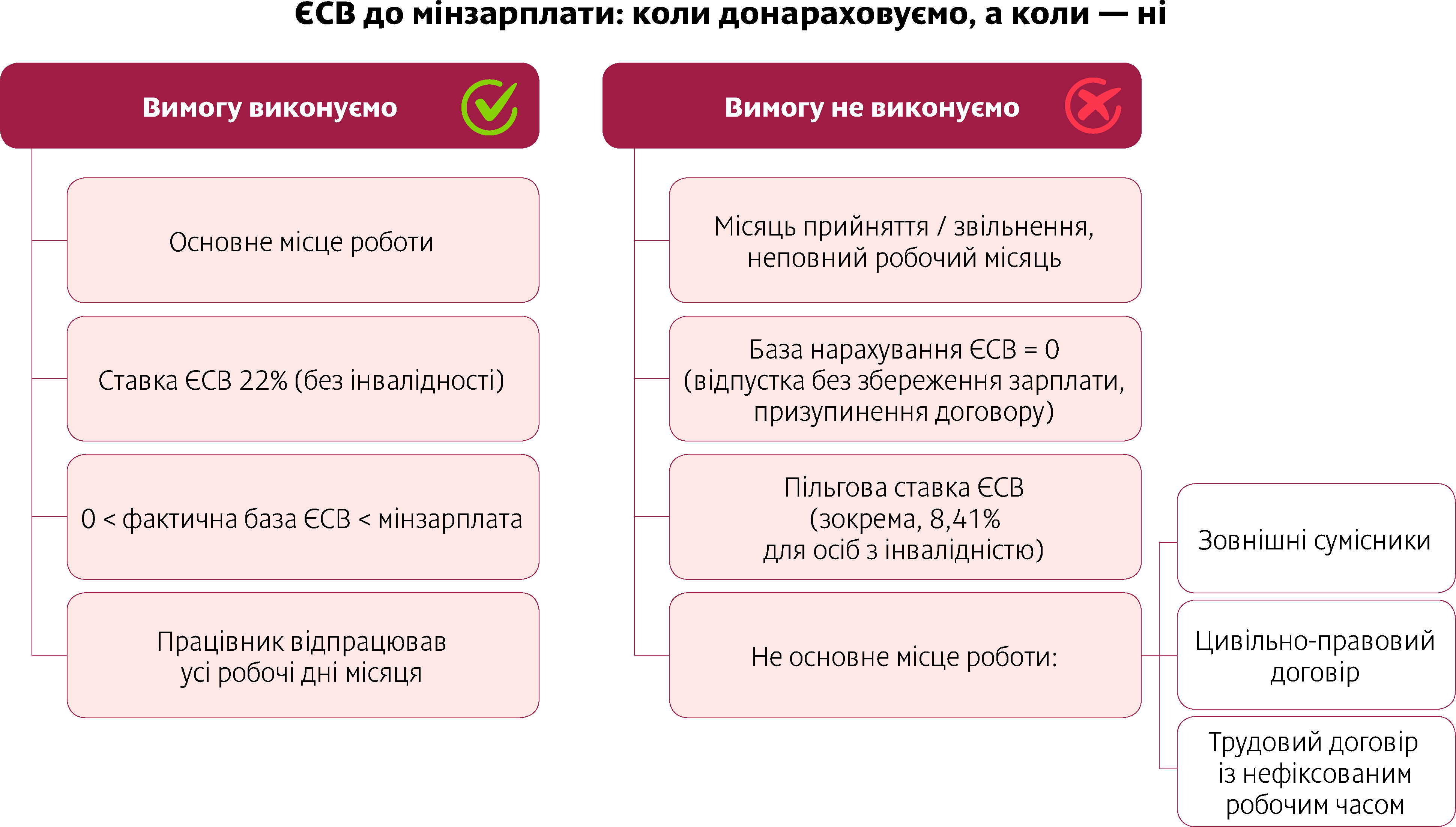- фактична база нарахування ЄСВ менша за мінзарплату;